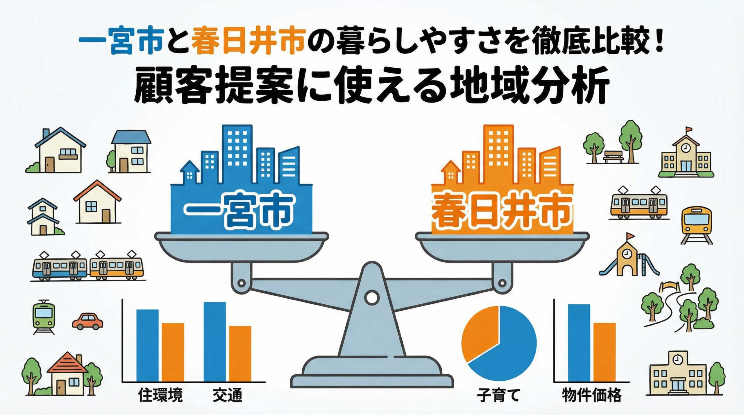 本記事では、愛知県内の不動産市場を知り尽くした業界関係者の方々に向けて、一宮市・春日井市の暮らしやすさ徹底調査を行いました。交通アクセス、資産価値、生活利便性、行政支援、災害リスクなど、顧客提案に直結する重要指標を網羅的に比較・分析しています。貴社の顧客への提案資料作成や、エリアマーケティングの戦略立案にお役立てください。